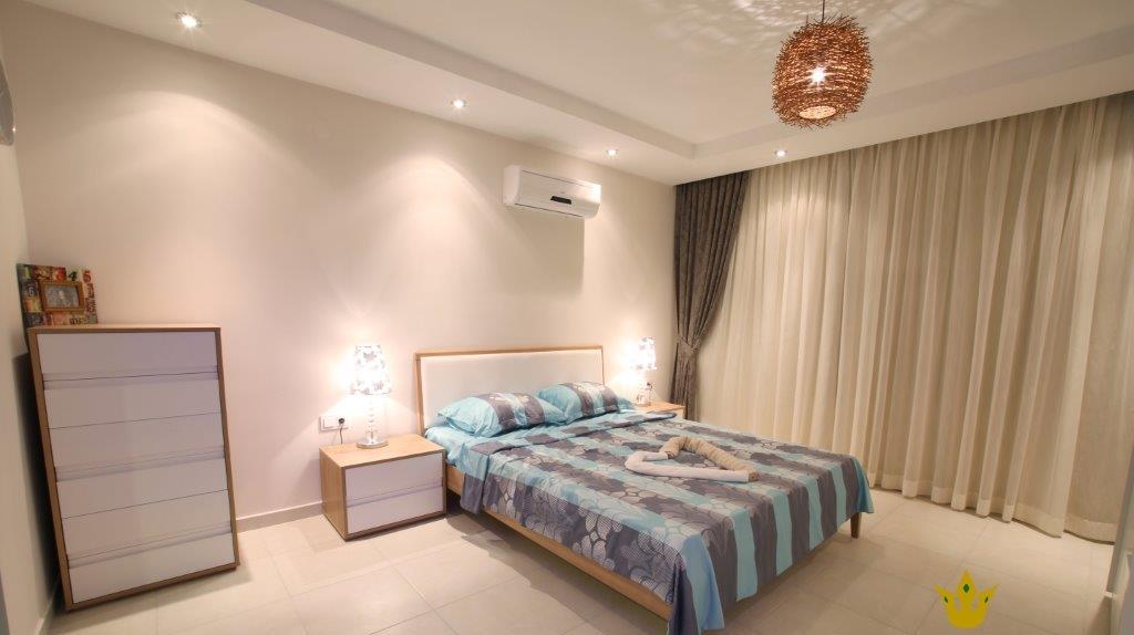 Квартира имеет очень качественную внутреннюю отделку, стены окрашены сатиновой краской на водной основе, двойные окна из ПВХ, на полу керамическая плитка, установлен кондиционер, проведены все коммуникации, Wi-Fi, спутниковая антенна, видео домофон, встроенная кухонная мебель, в ванной вся сантехника, душевая кабина и встроенные шкафчики.