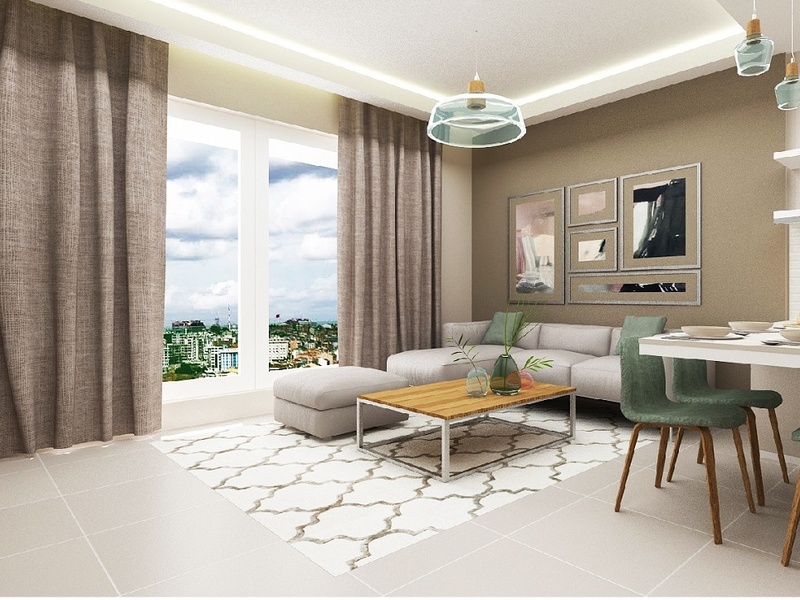 Квартира на 3 этаже в блоке Аура II, общей площадью 80 м2, с 1 спальной и ванной комнатами, гостиной с кухонной зоной, балконом, продается на начальном этапе за 55000 евро, а на этапе отделки 65000 евро.