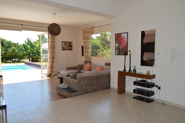 Направо от главного входа располагается очень просторная гостиная с двумя отдельными зонами отдыха. В одной из них есть камин. Раздвижные стеклянные двери из гостиной ведут на веранду, в прекрасный ландшафтный сад и к личному бассейну.