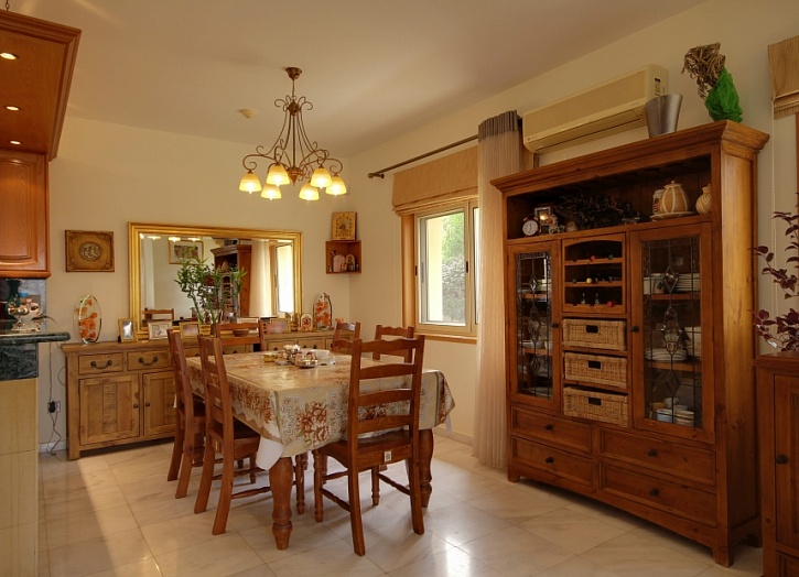Дом оснащен кондиционерами и полами с подогревом. В окнах - стеклопакеты с двойным остеклением, паркет в спальнях, в гостиной и столовой - мраморные полы, потолки – с отделкой натуральным дубом, в кухне и ванных комнатах - столешницы из мрамора. В доме мраморные лестницы, подсобные помещения, прачечная, кабинет с душевой кабиной, 2 гардеробные комнаты для хранения обуви и одежды, котельная, гараж на 2 автомобиля.