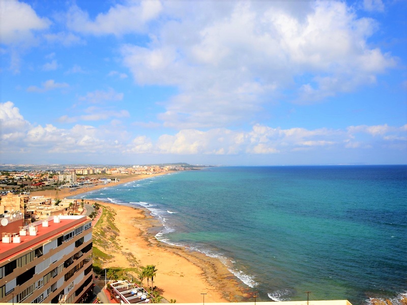 Apartment for sale in a suburb of Torrevieja, 20 meters from the beach of La Mata. The apartment has two bedrooms, one bathroom, a separate kitchen, a living room and a large terrace with a side sea view. Spacious and very bright rooms with all the windows facing the street. The apartment is fully furnished and equipped with home appliances, with great opportunities for improvement. The building is in very good condition, has two elevators, a ramp, a communal utility room and a common solarium with a magnificent view of the sea. It also disposes of an open parking at the entrance. Second line from the sea, in one minute walk from the beach, a local supermarket, a bus stop, many quality cafes, restaurants, etc. In close proximity to a huge number of services and amenities for tourists and residents of the area. Rocky coast with a magnificent underwater world, several natural bays and one of the best beaches of this coast – La Mata beach, stretching for many kilometres to be just a few minutes walk.