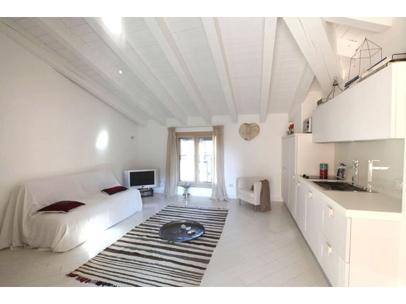 The apartment is composed of: a hallway, a multifunctional room which serves as a bedroom and living room with open kitchen, a powder room with built-in closets, bathroom and a wonderful 18 sqm terrace, which is fitted with a screen system designed by Corradi, which encloses the terrace in order to give it a unique privacy and allow it to be used during the entire year.