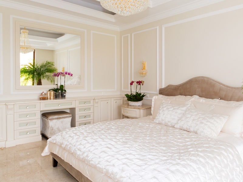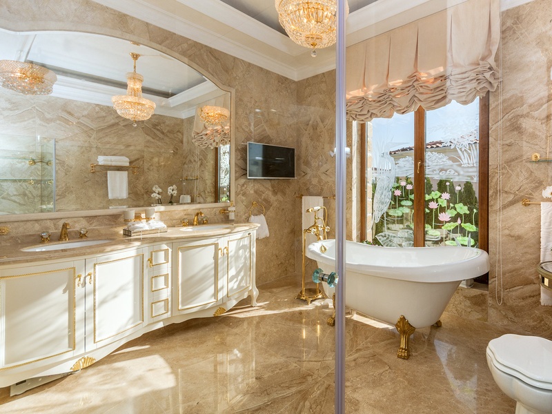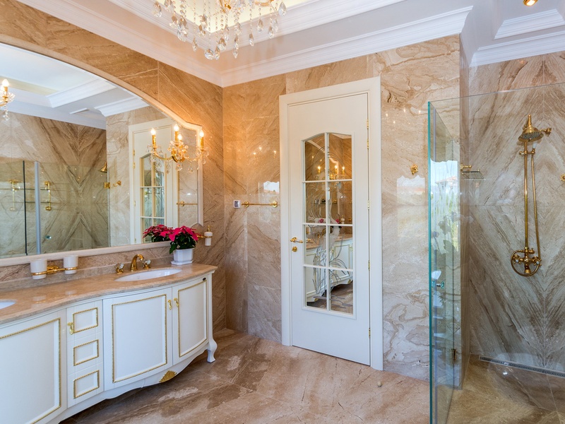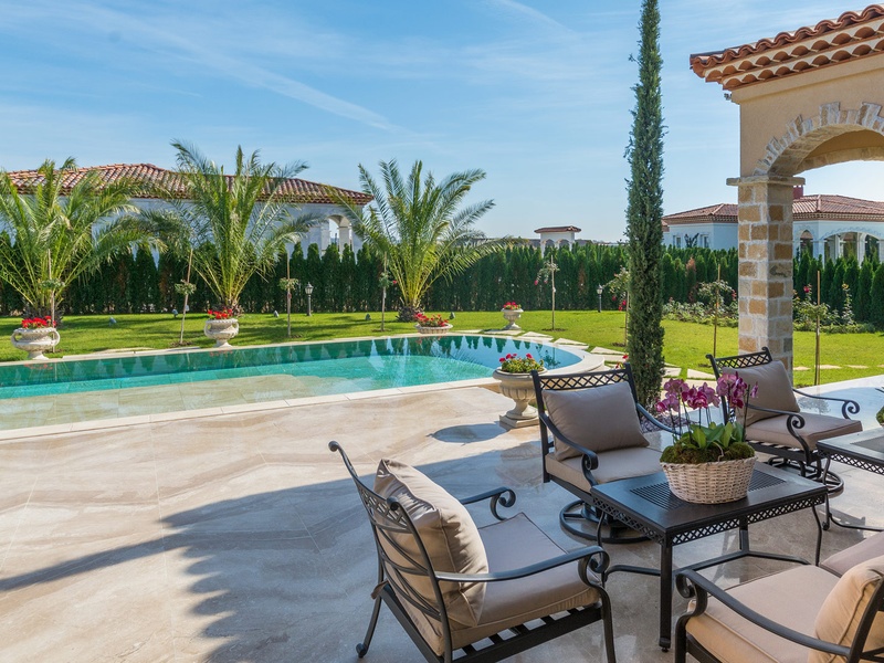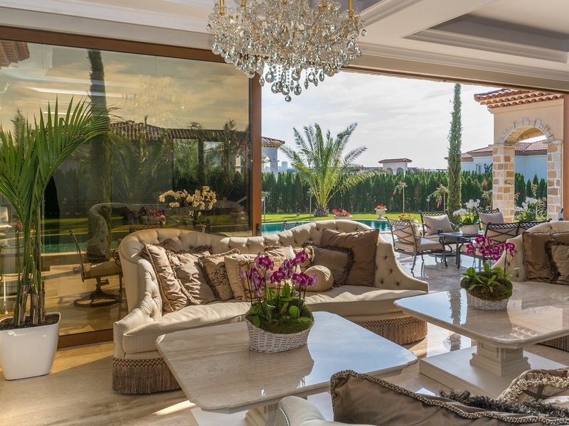 Through the impressive entrance you get into a spacious living room. The living space and the kitchen are in an open space ensemble. There is a large dining room with a table for ten and a kitchen. The living room has areas for relaxation and areas to have fun, and a large fireplace. East of the living room is a veranda to which one gets through large windows that can be opened up to form a big passageway, ideal for late night parties. There are three double bedrooms with en suite bathrooms and walk-in closets. The living room and two of the bedrooms overlook the backyard garden and the pool. The large swimming pool tiled with natural marble (Daino) lies in the centre of the garden. The garden itself is large and leafy, planted profusely with exotic trees and flowers, with space for deckchairs around the pool. The furnishings of the house are luxurious and very elegant, with custom-made furniture. The interior is made up of fine natural materials, natural marble Daino, and wood.