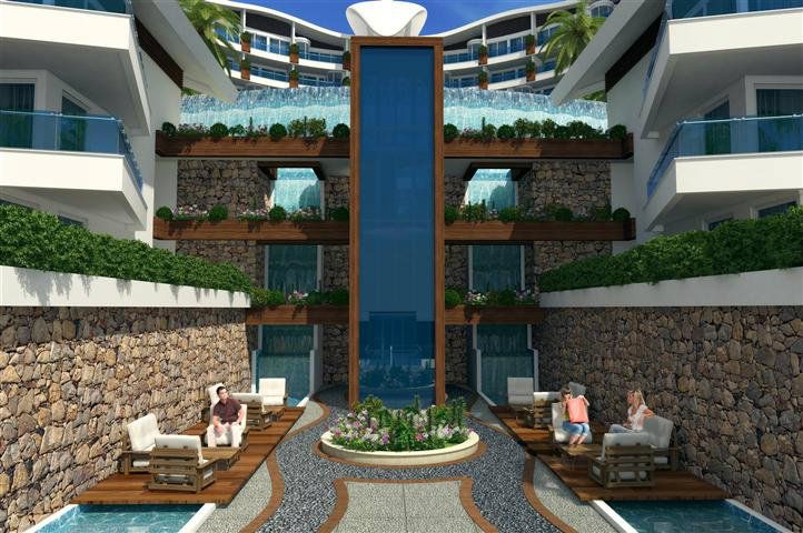 For water entertainment complex will have pools - outdoor infinity pool with a waterfall from the central unit to the reception area on the first level and a private basseyns whirlpool spa area, slides, sauna, Turkish bath, Finnish steam room and even special recreation room with ice and salt.
