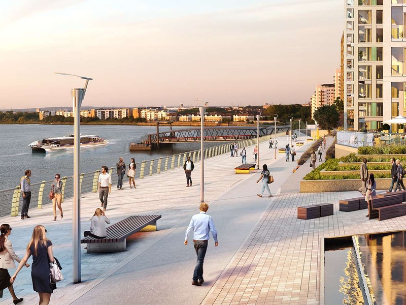 На берегу Темзы реализуется масштабный проект строительства жилого комплекса, состоящего из высотных  жилых блоков  с элитными апартаментами, в окружении фонтанов и зеленых скверов.