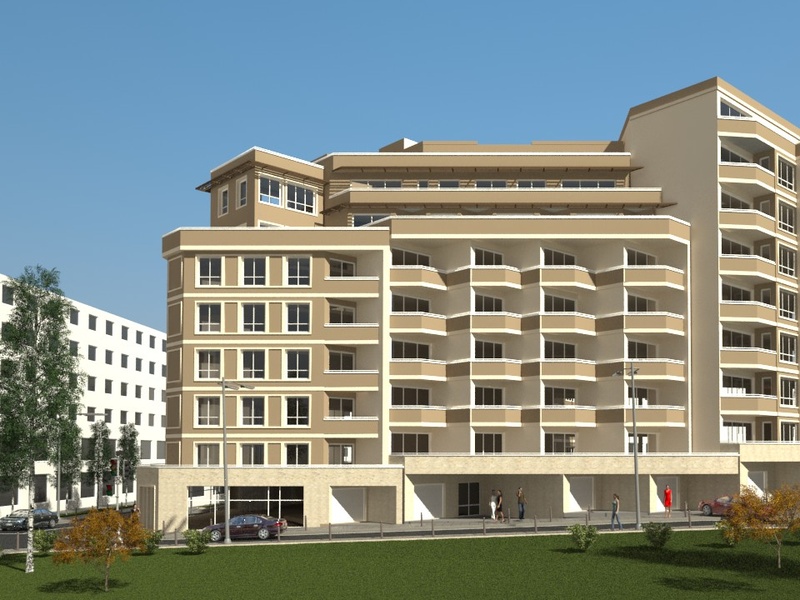 Здание имеет подвал, цокольный этаж и восемь этажей в трех отдельных входов с лифтами. Подвале и на первом этаже будут и гаражи и два магазина на первом этаже. В апартаментах есть одна или две спальни и студий.