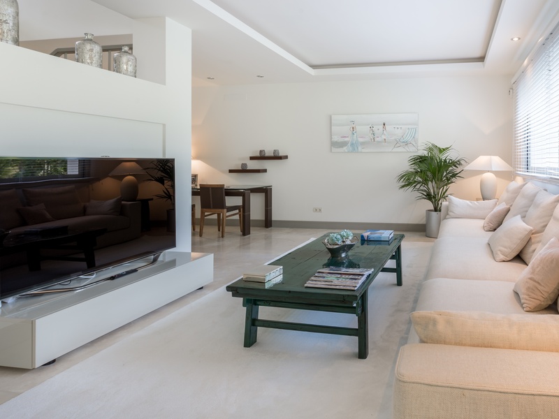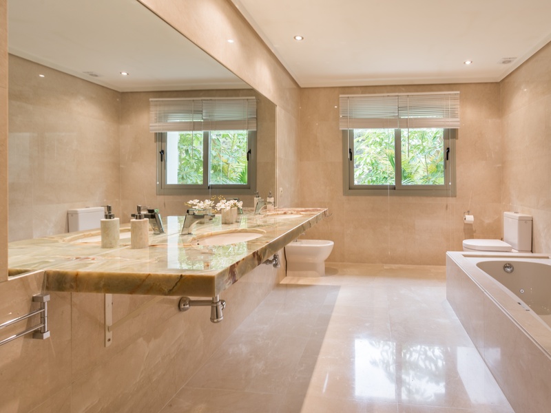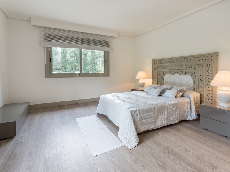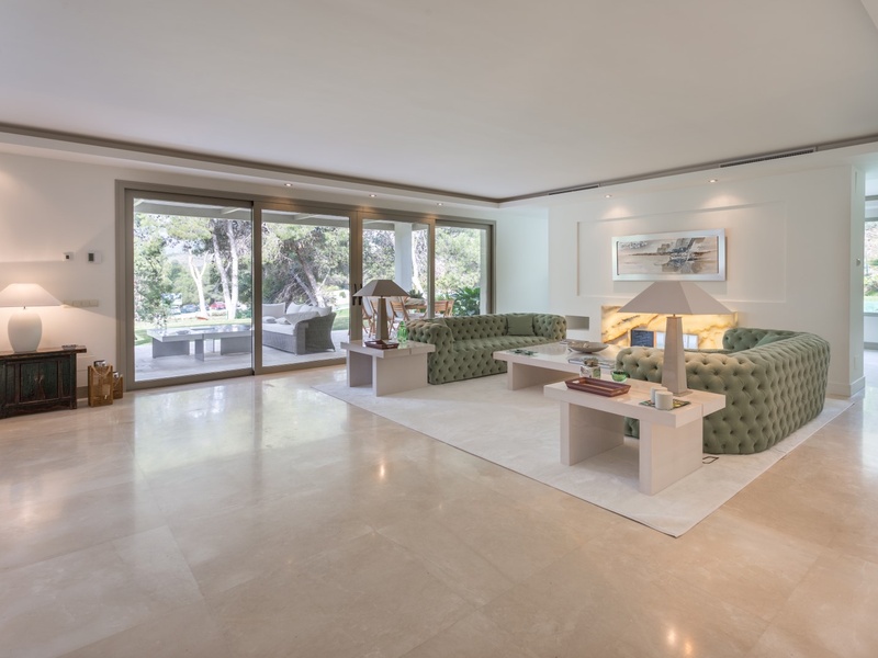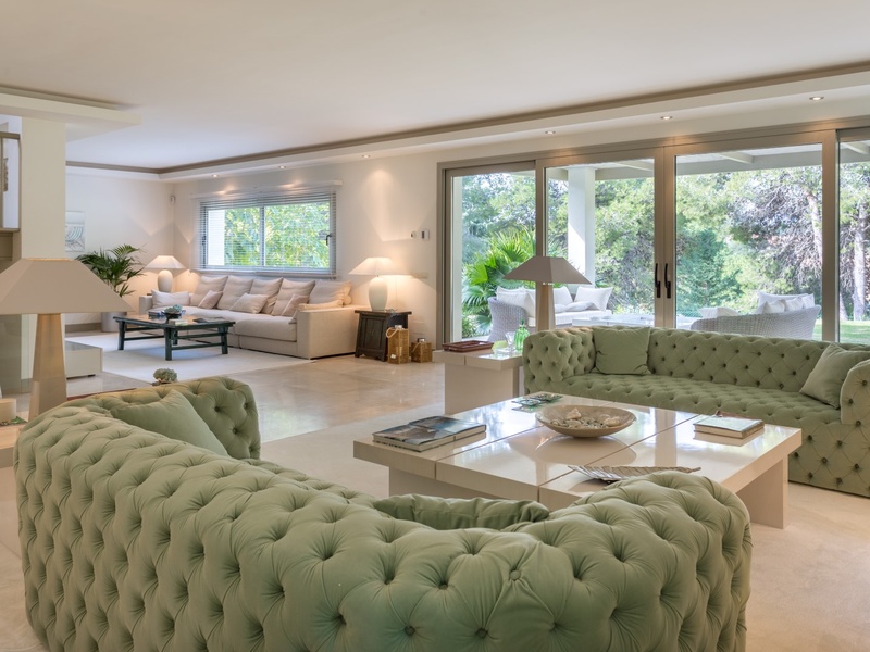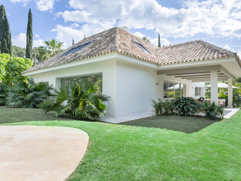 Excellent villa in Los Monteros based on white Spanish modern style with ceramic tile Arabic roof. Very close to the sea, frontline golf. Entrance hall, five bedrooms with en suite bathrooms, guest toilet, main hall, lounge, dining room, living room, kitchen, porch, all of them very large. Onyx fireplace lounge and dining room. Aged marble flooring in porch and gardens. Marble floors on ground and first floors except in bedrooms. 4 car garage. Room facilities. Storage rooms of over 100 m2. Oversized pool with waterfall emerald tile, lighting color. Ideal for golf enthusiasts. Very calm tranquil area with direct access to the golf courses and close to the sea.