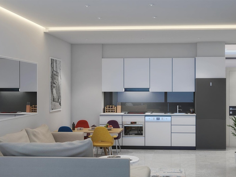 Wohnung 1 + 1, Gesamtfläche von 60 qm. Wohnzimmer mit amerikanischer Küche, Schlafzimmer mit Bad und Balkon. Preise ab 59.000 Euro.
