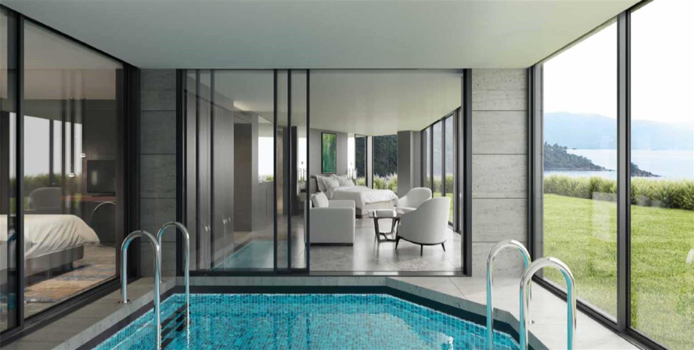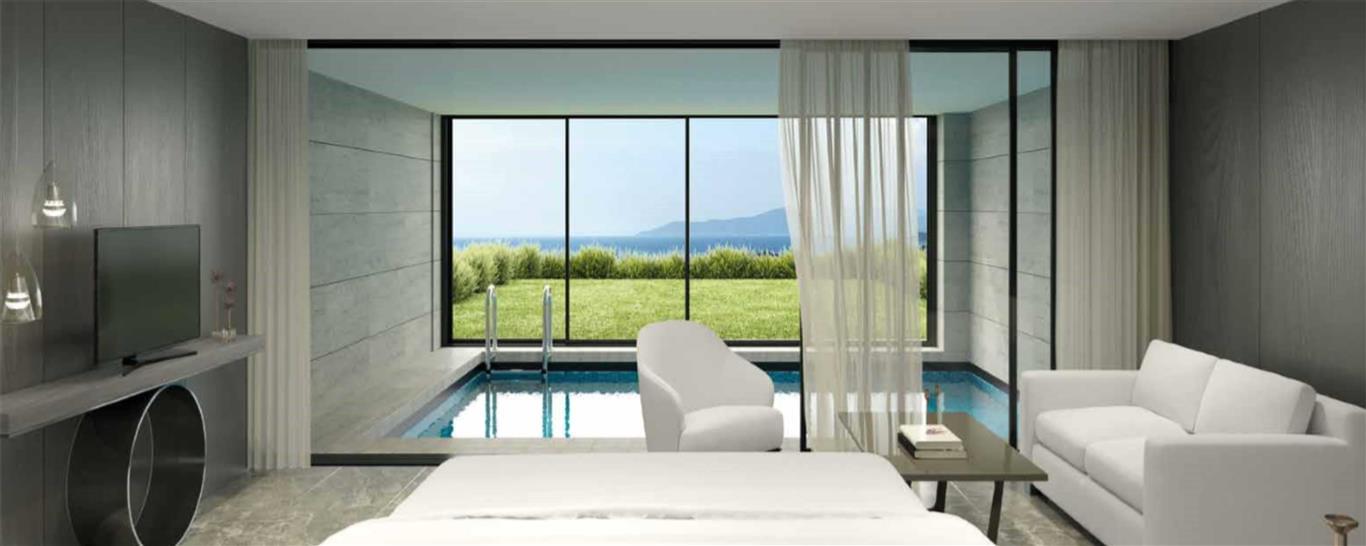 Eines der wichtigsten Mottos dieses Projekts: "Sicherheit zu Hause, Hotel Luxus!". Jedes der 3-Schlafzimmer-Terrassen oder eine zweistöckige Gartenresidenz mit vier Schlafzimmern kombiniert ein ausgezeichnetes modernes Design mit viel Liebe zum Detail und verspricht einen unvergleichlichen Luxus mit Blick auf das spektakuläre Panorama der Ägäis.