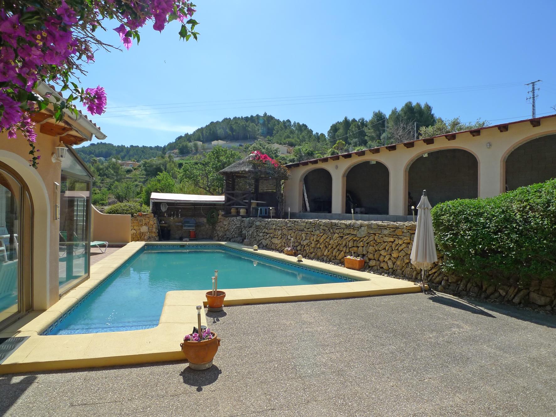 Charmante freistehende Villa mit einer atemberaubender Aussicht, auf einem großen Grundstück mit 2 Etagen gelegen und von den jetzigen Eigentümern gebaut. Wenn Sie im Hauptbereich des Grundstücks ankommen, können Sie sehen, dass das Anwesen um den Poolbereich herum gebaut wurde, was dem Außenbereich ein tolles Terrassengefühl verleiht. Das Hauptwohn - Esszimmer verfügt über eine verglaste Veranda mit großen Schiebetüren, die geöffnet werden können, sodass die Wintersonne ins Innere des Hauses gelangen kann. Es verfügt über einen Holzofen und ein schönes Atrium mit einem gepflegten Whirlpool. Von hier aus haben Sie Zugang zu einem weiteren Raum, ebenfalls mit Holzofen, Holzbalken und Blick auf den Pool. Über einige Stufen gelangen Sie zu einer großen Küche im amerikanischen Stil mit Essbereich und Zugang zu einer offenen Naya, ideal für Frühstücke in den Sommermonaten mit schöner Aussicht. Auf der gleichen Ebene befindet sich ein geräumiges Hauptschlafzimmer mit Einbauschränken, Klimaanlage und eigenem Bad. Über eine Innentreppe gelangen Sie zu zwei weiteren Schlafzimmern, alle mit Einbauschränken und Ventilatoren. Auch in diesem Bereich gibt es ein großes Badezimmer. Der Außenbereich verfügt über eine überdachte Sommerküche, ein Badezimmer, einen überdachten Grillplatz, eine hölzerne Pergola, ein großes 12 x 50 m großes Riu Rau, das eine leere Leinwand darstellt, und eine zweite große 19 x 13 m große Einheit, die umgebaut werden könnte in einen bewohnbaren Bereich. Alles oben Genannte befindet sich rund um den Pool. Es verfügt außerdem über einen großen Lagerbereich, in dem sich die Poolpumpe befindet, eine große Garage, die in eine große Werkstatt umgewandelt wurde, ideal für jemanden mit Hobbys, und eine weitere Pergola. Sie müssen es sehen, um die unendlichen Möglichkeiten zu entdecken, die in dieser Immobilie möglich sind.