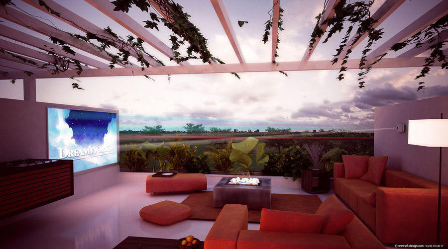 * На террасе пентхауса белая деревянная беседка