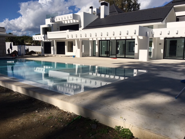 Fantastic new villa in Guadalmina Baja, second beach line. Built 1200 m2 on a plot of 3000 m2, with 4 bedrooms, plus another bedroom with its own kitchen. The villa is not furnished. Living room with fireplace almost 100 m2 and 6 meters high ceiling...